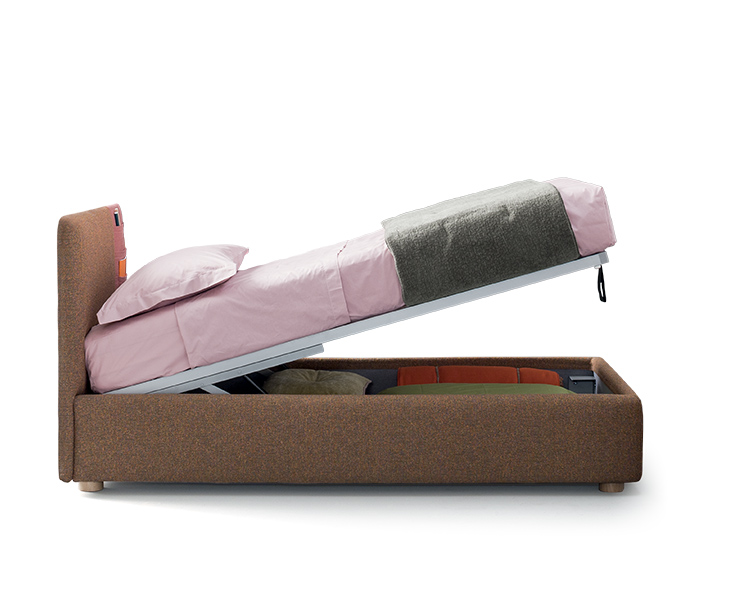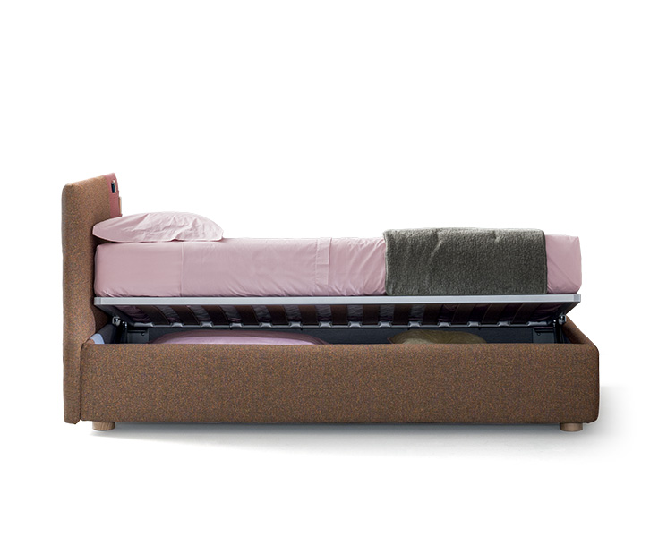 Letto singolo contenitore rivestito in tessuto. Disponibile in tre diversi sistemi alzarete e fondi contenitore. I piedini sono realizzati in legno colore naturale. Il letto è realizzabile in diverse colorazioni e dimensioni.
