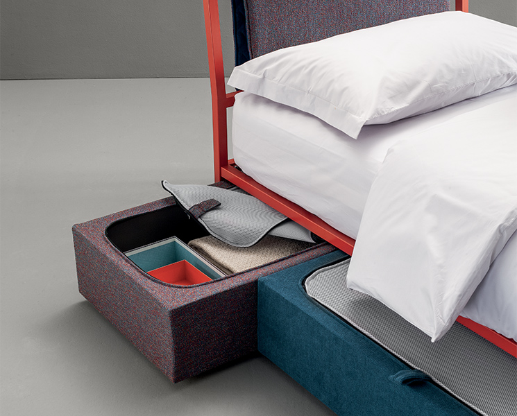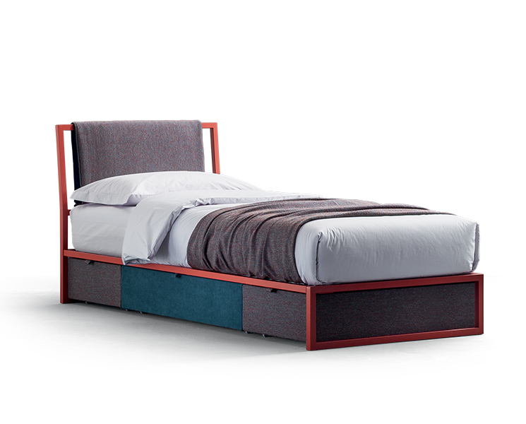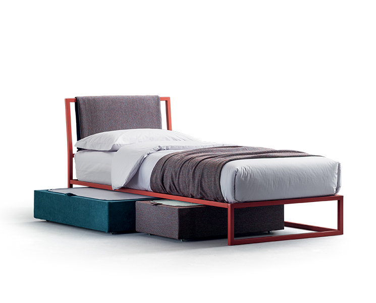 Letto singolo in ferro con cassettoni contenitori. Disponibile anche nella versione senza contenitore e nella versione sommier. La testiera è personalizzabile. Disponibile come optional il rivestimento dei cassettoni: i cassettoni sono dotati di cerniera e tessuto tecnico traspirante e antipolvere. Il letto è realizzabile in diverse colorazioni e dimensioni.