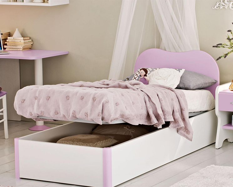 Letto singolo in legno con contenitore. Disponibile anche nella versione senza contenitore. Il letto è personalizzabile per finiture, materiali, colori e dimensioni.